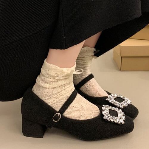 ビジュー 内起毛 ストラップ ミドルヒール パンプス !送料込み!