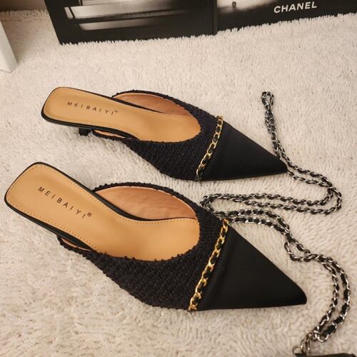 ツイード つま先切りかえ チェーン装飾 ミュールヒール !送料込み!